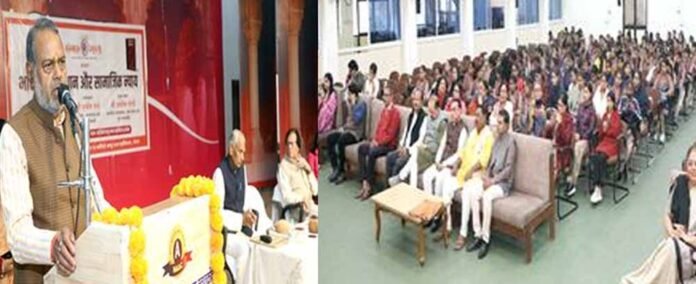 प्रमुख वक्ता श्री अशोक पाण्डे ने कहा कि देश की आजादी के 75 वर्ष होने के बाद भी समाज में सामाजिक समानता की वह बानगी नजर नहीं आती है जिसकी परिकल्पना हमारे स्वतंत्रता आंदोलन के पूर्वजों ने की थी। उन्होंने भारतीय संविधान के गठन की 1927 में साइमन कमीशन से लेकर अक्टूबर 1946 में संविधान सभा के गठन तथा 26 जनवरी 1950 को संविधान लागू किए जाने वाले घटना चक्र पर विस्तृत प्रकाश डाला। उन्होंने कहा कि भारतीय संविधान की मूल भावना समाजिक सामानता और न्याय पर आधारित है, उनका मत है कि सामाजिक न्याय का सिद्धांत तभी लागू हो पायेगा, जब प्रत्येक नागरिक अपने अधिकारों के साथ कर्त्तव्य और दायित्वों पर अमल करेगा। उन्होंने कहा कि शासन-प्रशासन के जितने भी कानून बनते है वह सामाजिक न्याय के मूल सिद्धांत के तहत ही बनाए जाते है। इसके बावजूद सामाजिक न्याय की व्यवस्था कमजोर नजर आती है। उन्होंने कहा कि इसके मूल तीन कारण है एक जनसंख्या विस्फोट संसाधनों से अधिक दोहन, दूसरा परिवारों में संस्कारों पद्धति का समाप्त होना और तीसरा कारण हमारी बढ़ती भोग प्रवृति है। इससे समाज में राग, द्वेष घृणा को प्रवृति बढ़ी है। नागरिक अपने कर्त्तव्यों के स्थान पर अधिकारों की बात करते है। उन्होंने 26 मई 1939 में राष्ट्रपिता महात्मा गॉधी द्वारा सम्पादित समाचार पत्र "हरिजन" का उद्हरण प्रस्तुत करते हुए कहा कि महात्मा गॉधी ने लिखा था कि जब व्यक्ति अपने कर्त्तव्यों का पालन करता है तो अधिकार अपने आप प्राप्त हो जाते है। बाबा साहेब डॉ. भीमराव अम्बेडकर ने समरस समाज की स्थापना का स्वप्न देखा था। जिसमें सभी में प्रेम, स्नेह, समर्पण, त्याग का भाव होगा, सभी मिलकर एक सामाजिक समानता वाले समाज का निर्णाण करेंगे।